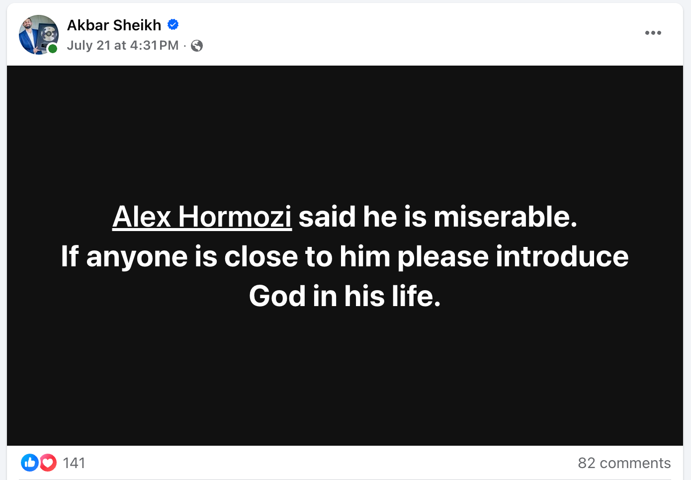 I felt sadness in my spirit the entire day after seeing that clip about Hormozi. I started to pray for him, and then I stopped.